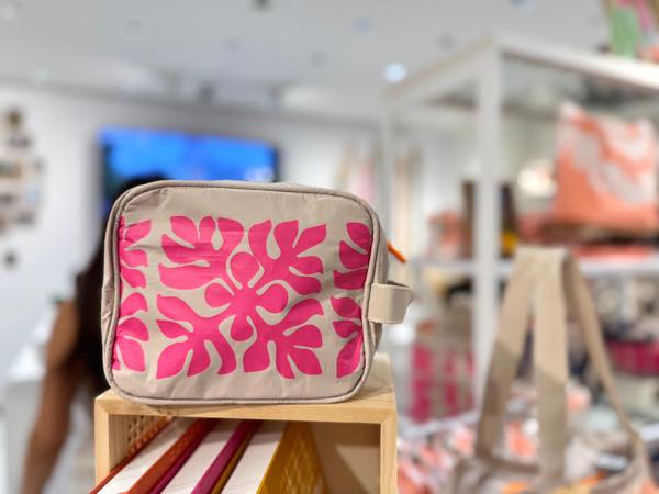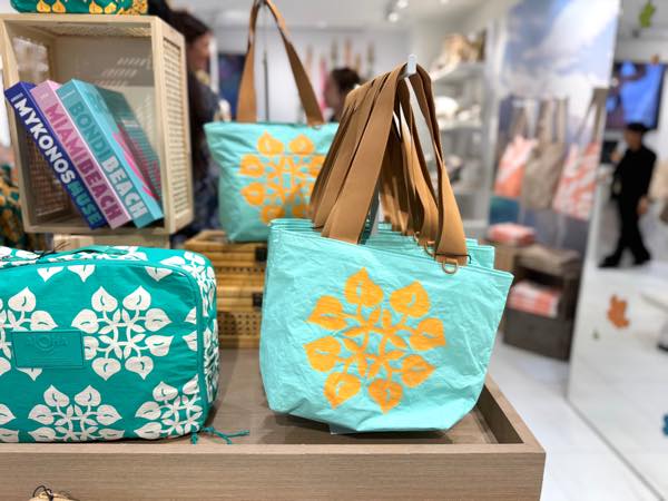 軽くて丈夫、水にも強い機能性と、ハワイらしいデザインが魅力のバッグやポーチは、旅行中はもちろん帰国後も使いやすいアイテムとして人気を集めています。空港内で搭乗前の時間を利用してゆっくりショッピングができるのも嬉しいですが、空港店限定のアイテムが数多く揃っているのも見逃せません!下の写真1枚目、2枚目は空港店のみで購入可能な限定デザイン。(1枚目の右側トートバッグ$58.00、2枚目中央トートバッグ$64.00、3枚目ポーチ$48.00)