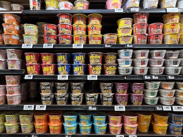 韓国といえばキムチ!ですが、白菜や大根などの生鮮野菜が豊富で、キムチやキムチの素ももちろんさまざまな種類が揃います。「辛ラーメン」などの即席ラーメン、カップラーメンもこの通り!コリアンフードが好きな人はマストゴーですよ!