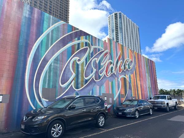クイーンストリート沿いの駐車場内にあるウォールアート。クールな色使いと「Aloha」と描かれたタイポグラフィがかっこいい!カカアコエリアのウォールアートの中でも人気のスポットです。