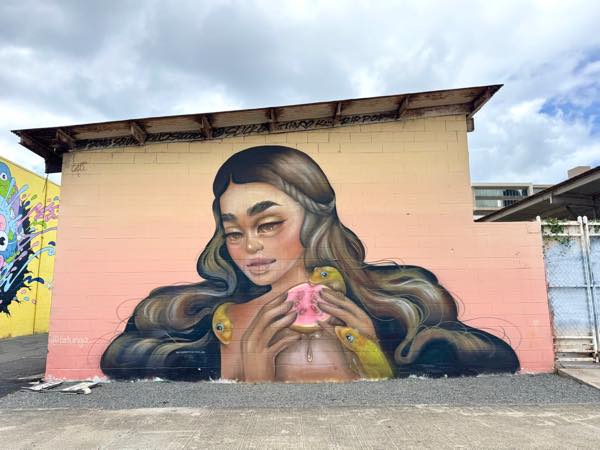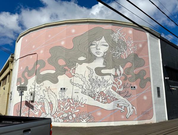 ポフカイナ通りをアラモアナ方面へ歩いて行くと、コーラルピンクが目に留まるマーメイドのウォールアートが目に入ってきます。