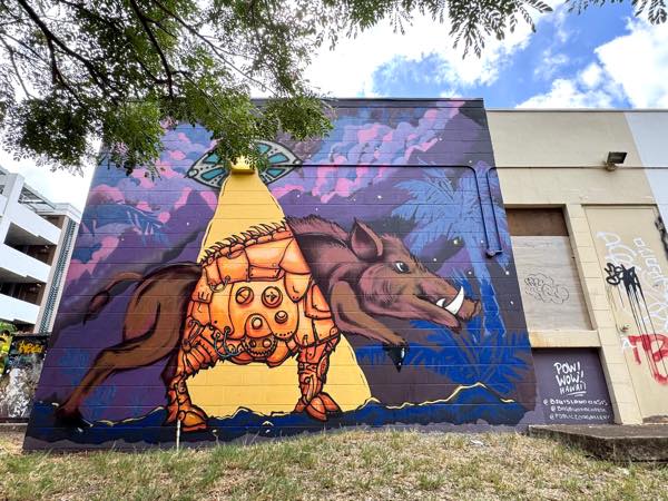 宇宙船に照らされるイノシシを描いたウォールアート。彼は自然界の動物やハワイのモチーフにSF的な要素を組み合わせる作風で知られていて、この作品も「ハワイの野生動物と宇宙(未知)との交差」をユーモラスに描いたものと解釈されています。