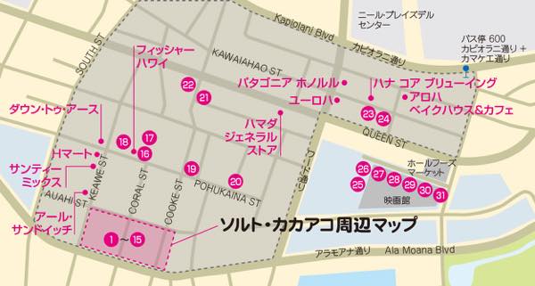 カカアコの街歩きは、海側・アラモアナブールバード沿いにあるソルトの周辺から山側へ向かって散策していくイメージです。