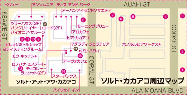 アートを見ながら、カカアコの中心とも言える「ソルト・アット・アワ・カカアコ」方面へ向かいましょう。ソルトの店舗情報もマップに入れました。