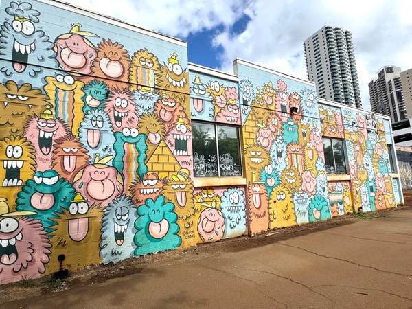 クック通りの人気アート。アラモアナセンターにあるターゲットの壁画も手がけたクリス・ゴトウの作品。個性的でポップな色合いが目を引きます。