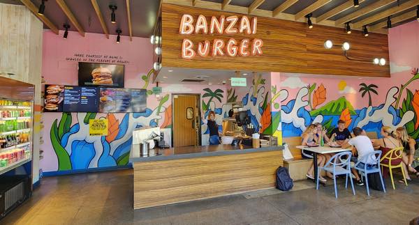 インターナショナルマーケットプレイス1階のクヒオアベニューフードホール内に入っているバーガーショップ「バンザイ・バーガー」。王道のアメリカンなバーガーが楽しめるお店です。