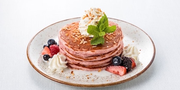 シグネチャーロイヤルハワイアンピンクパレスパンケーキ $32.00は、女子なら頼みたい可愛いパンケーキ!ミックスベリーのコンポート、ハウピア(ココナッツソース)、そしてトーストココナッツがトッピングされています。