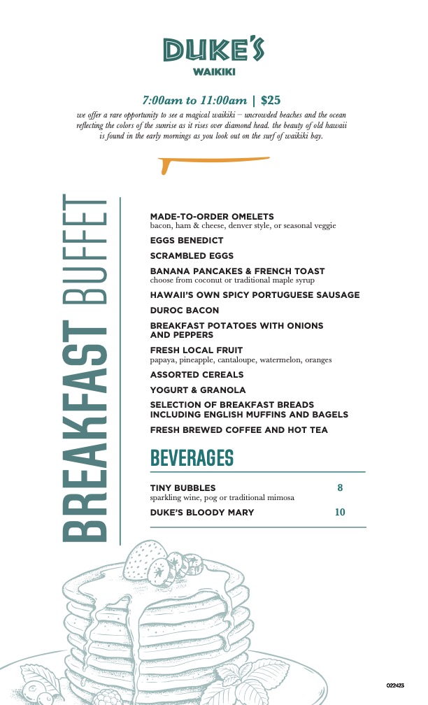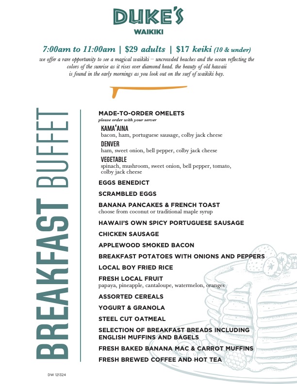 ハワイのレジェンド、デューク・カハナモクがサーフィンやカヌー、水泳を楽しんだワイキキビーチ。そんなワイキキビーチを望みながら、朝食ビュッフェをいただけるのが、アウトリガー・ワイキキ・ビーチリゾート内にある「デュークス・ワイキキ」。