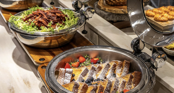 朝食ビュッフェでは、ホットブレックファスト、ブレックファストミート、コールドブレックファストなど計4つのカテゴリで構成されていて、スクランブルエッグ、カリカリベーコン、ライス、ベネディクト、ヨーグルト、フルーツ、クロワッサンやマフィンなどが楽しめます。