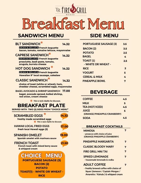 ”ブレックファストカクテル” として、パイナップルマルガリータ、クラシックブラッディマリー、ファイヤーグリルマイタイ、レモネードなどのミモザが$7で楽しめます。