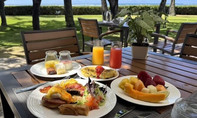 カハラビーチを眺めながら、優雅な食事が楽しめるオープンエアのレストラン。朝食やディナーのビュッフェが人気!