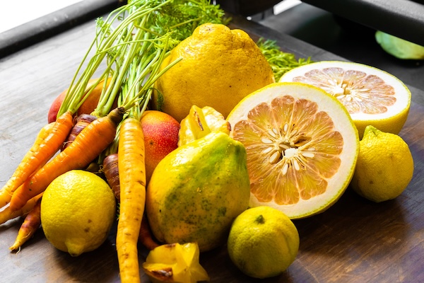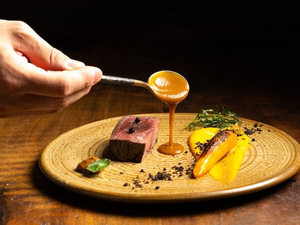 ビーフのキアヴェグリル ローカル人参のロティとマカデミアナッツ味噌、ハワイ島産生胡椒