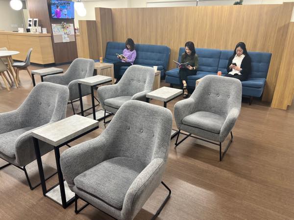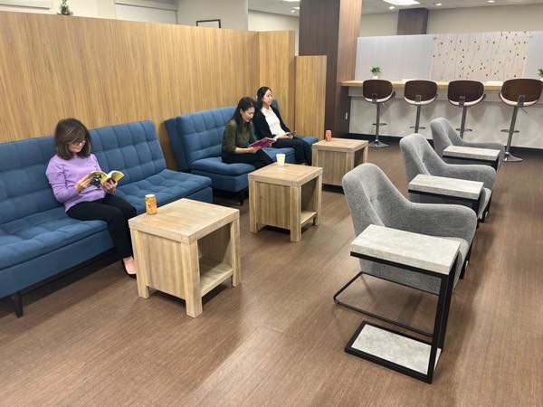 ラウンジでは、コーヒーやジュースなどのドリンクを無料で楽しめるほか、Wi-Fi、スマートフォン充電、PC利用なども可能。
