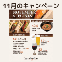 ■通常のハッピーアワーでは、おうどんやお寿司、お刺身や一品料理など、様々なメニューが$1〜$3割安に!色んな料理をお得に楽しむなら通常のハッピーアワーがおすすめです♪