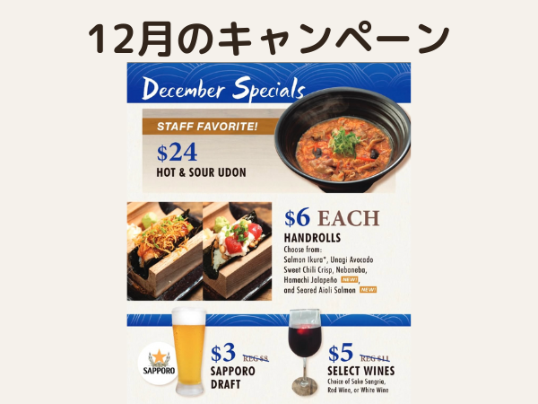 ■通常のハッピーアワーでは、おうどんやお寿司、お刺身や一品料理など、様々なメニューが$1〜$3割安に!色んな料理をお得に楽しむなら通常のハッピーアワーがおすすめです♪