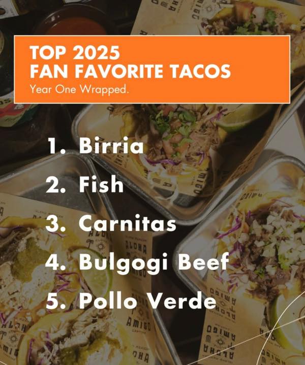 アロハアミーゴで2025年人気だったタコスを発表!!堂々の1位は、ほろほろお肉のタコスをコンソメスープに浸して食べるビリアタコス!ビリアタコスに続き、フィッシュタコス、カルニタス、プルコギビーフ、ポヨ・ベルデとなりました。