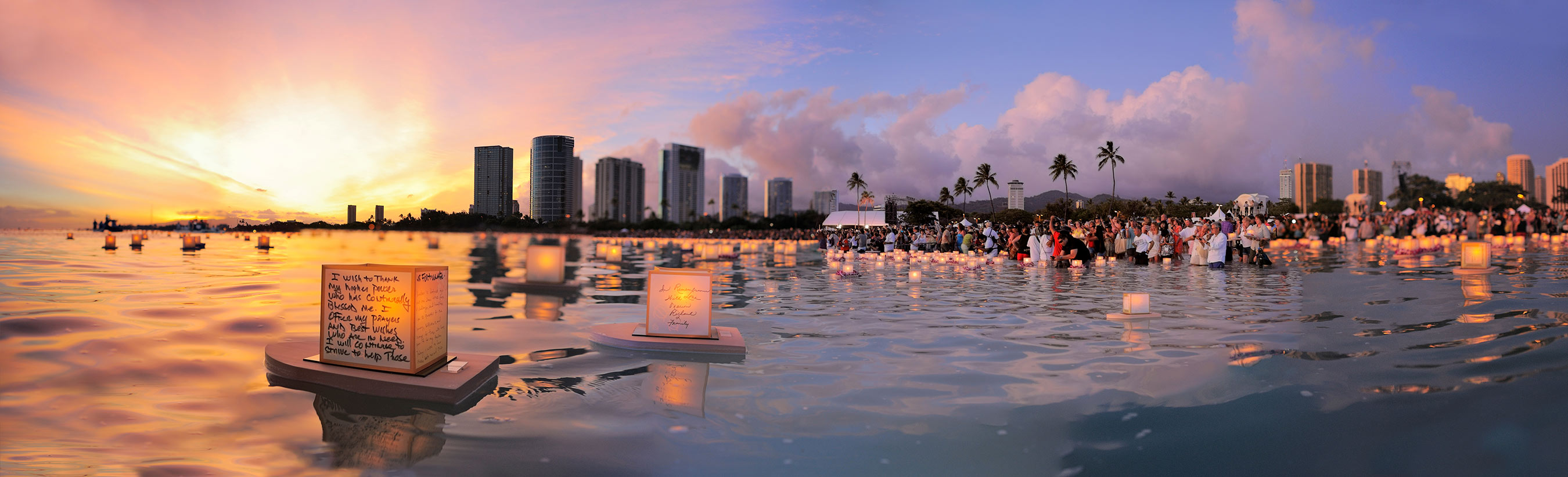 毎年、アラモアナビーチで夕方から灯籠流しが行われます。