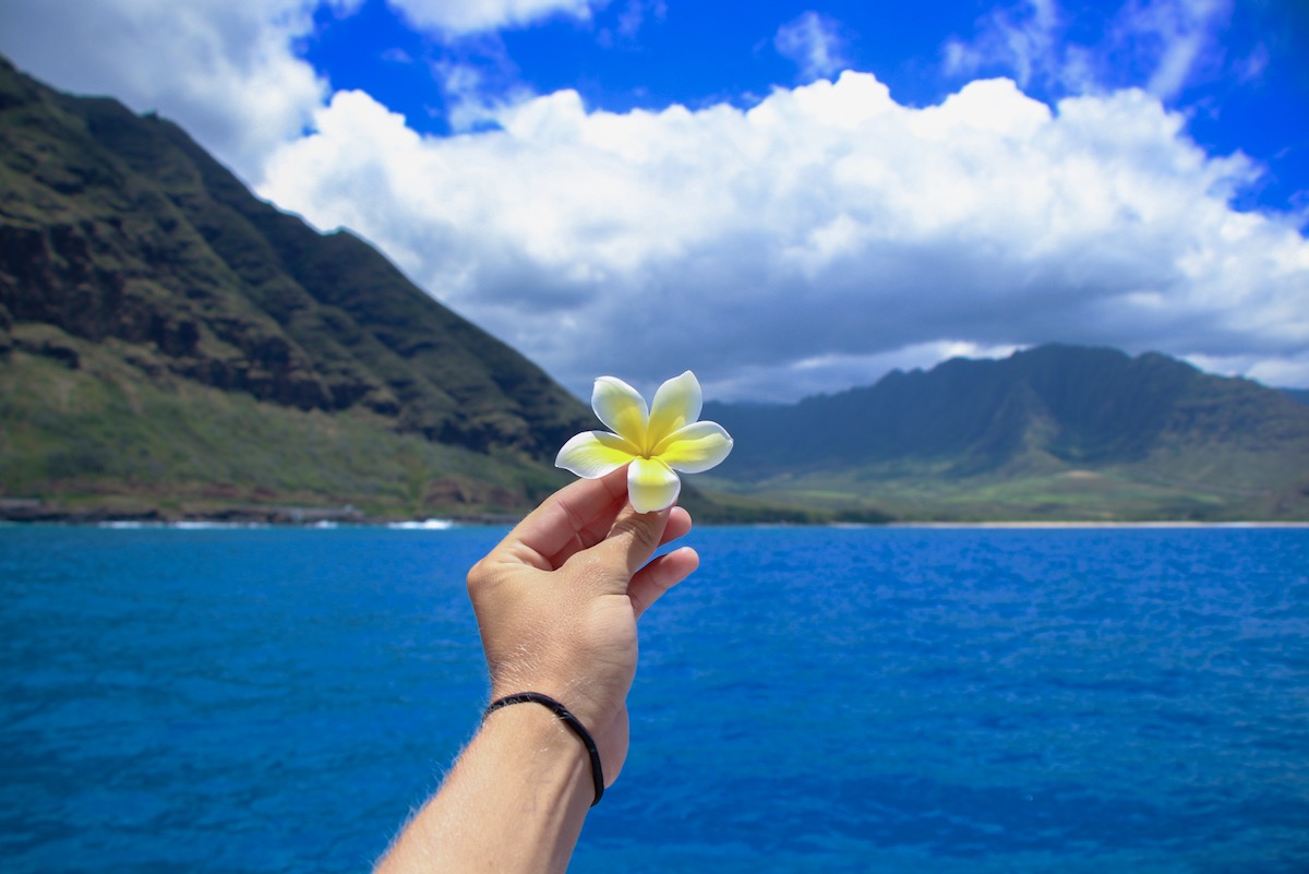 ワイアナエ沖の海は今日もビューティフル!アメージングな青色の海と空には、ホワイト&イエローのプルメリアがよく映えますね!ハワイでは女性だけに限らず、男性も耳飾りをつけているのにお気付きですか?耳飾りをつける時は、既婚者、または恋人がいる場合は「左」、独身または未婚は「右」です。覚えておくと便利ですよ~。