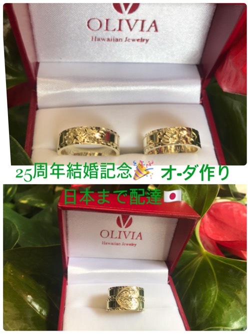 日本まで配達25周年結婚記念ペア指輪2人ハ-ト合わせて一つハ-トになりデザインオ-ダ反対側にはお花と亀彫り内側にメッセージも彫りましだね〜❣️