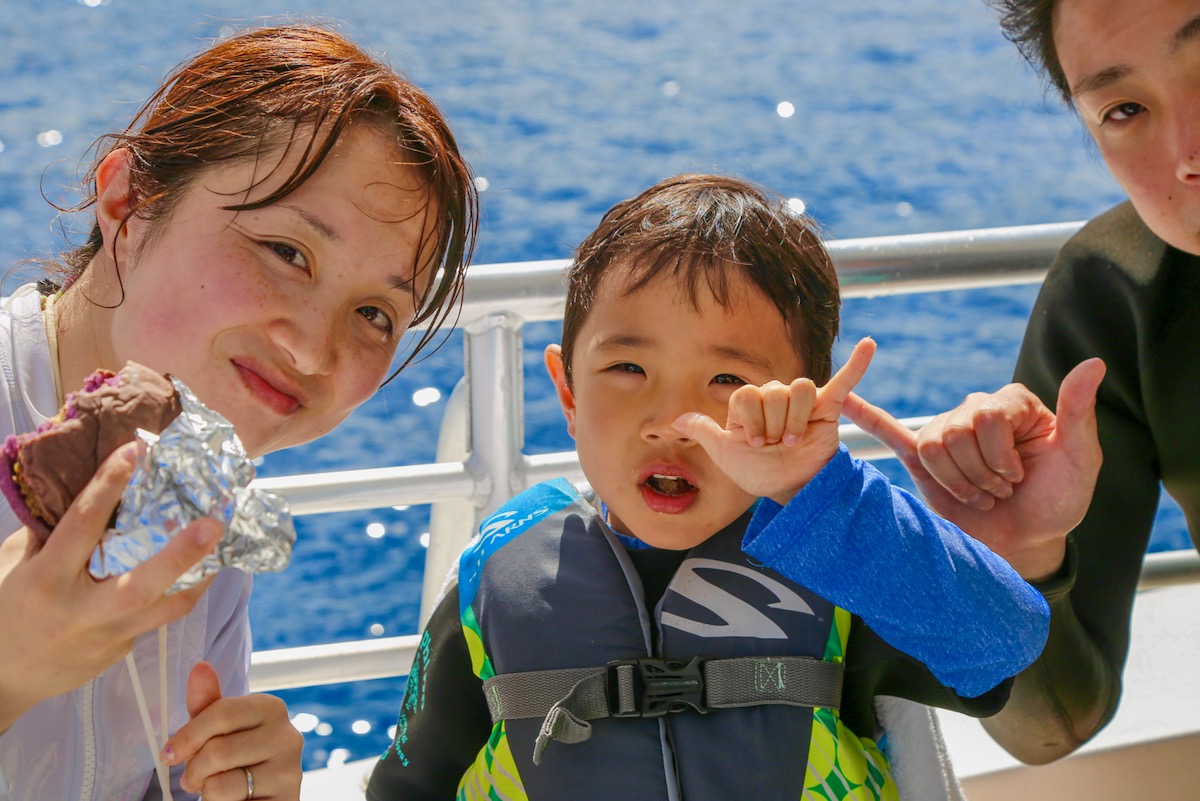 パパ&ママと一緒に野生のイルカに会いに来た男の子。テレビや本、水槽の中でしか見たことのなかったイルカが目の前にあらわれて大興奮!お腹がペコペコになったところでアリヤ号の人気タロバンズ・チーズバーガー♪美味しくってご機嫌シャカポーズ❤︎