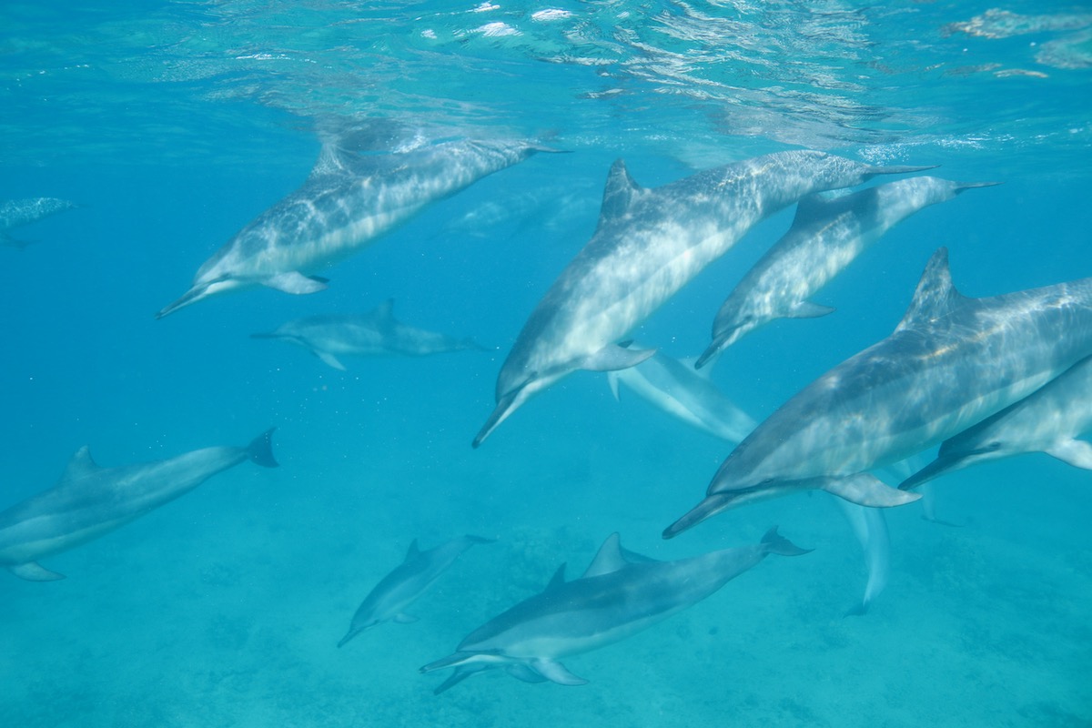 待ってました!イルカの大群がやってきましたよ~♪野生なはずなのに、とにかくフレンドリーなイルカくんたち。笑っているような表情やおしゃべりしているように見えるイルカがいますね!ラッキーな時にはキュンキュンというサウンドも海の中で聞けちゃうことも!