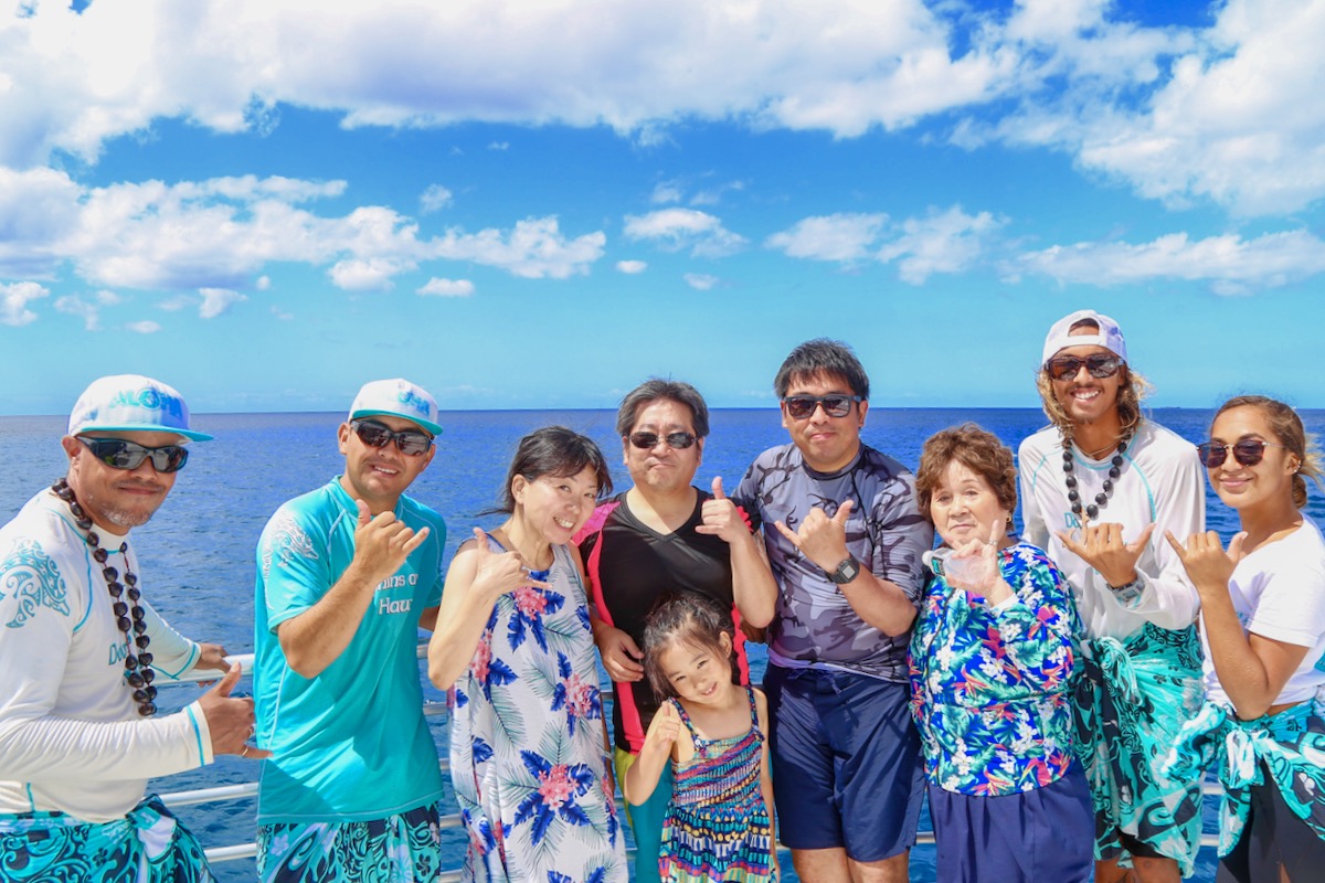 3世代揃ってハイポーズ♪キッズからおばあちゃままでみんなで楽しめるのがドルフィン&ユーの野生のイルカと泳ぐツアー。陽気なクルー達とフラを踊ったり、スタンドアップパドルやカヤックでお散歩したり、ハワイの素敵な思い出を作ってくださいね!