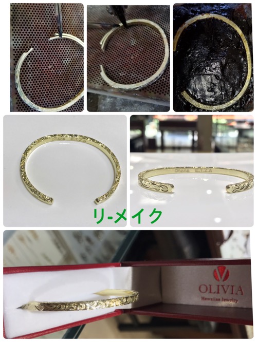 ほかの店で作ったグリーンゴルドバングルがうすいのでグリーンゴルド付けてからまだ彫りリ-メイクですね〜内側に家族イニシャルメッセージも彫りましだ❣️わざわざOliviaにいらしてありがとうございます。