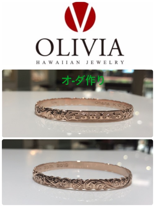30周年記念ハワイ旅行オリジナルオ-ダ作りバングル選んだハワイアン語幸せ意味Laule‘a右左にモンステラとお花彫り内側に家族イニシャルメッセージ彫りオ-ダ日本まで配達ですね〜❣️