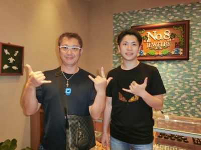 トランプインターナショナルホテルにお泊りの、すすむさん&うきょう君です東京からハワイに家族旅行で来られましたオーダーメイドのゴールドのハワイアンジュエリーをお買い上げです良くお似合いですよまたお会いできる日を楽しみにしてます
