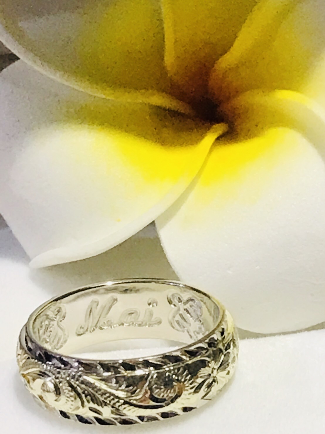 こちらの画像は6mm幅のRing裏にホヌ(ウミガメ)を彫りました。ホヌはハワイでは幸せの象徴!裏にも表にもプルメリアやホヌ、ハイビスカスも彫れますので、気軽にスタッフにご相談ください。