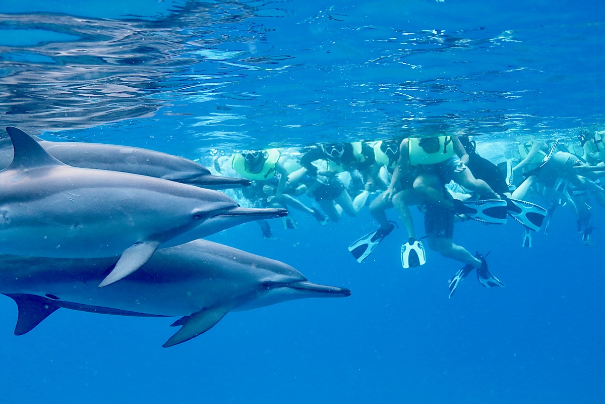 そんな素晴らしい場所にいるのが、野生のイルカくんたち。このエリアに生息しているイルカはスピナー・ドルフィンという種類で、日本ではハシナガイルカという名前で知られています。アクロバティックにスピンしながらジャンプするのが特徴です。そして何よりフレンドリー♡
