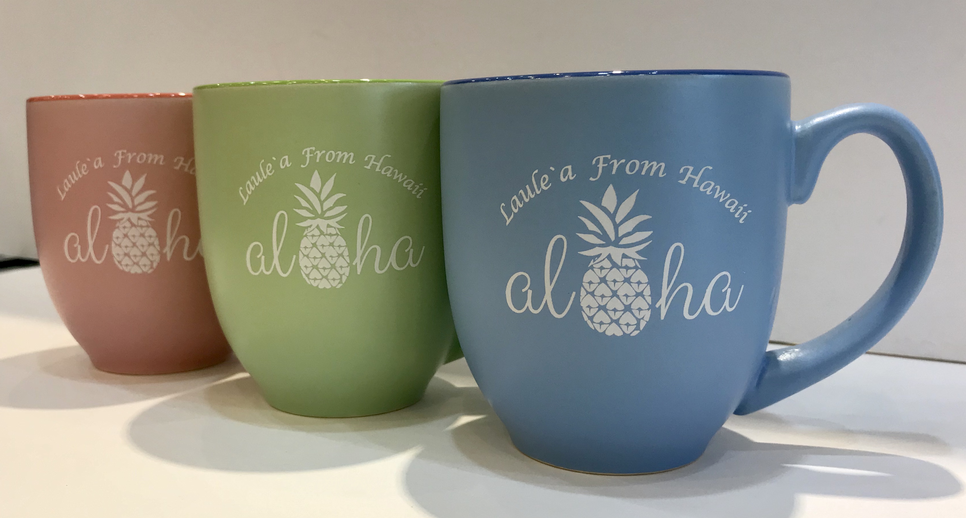 パイナップルとAlohaの文字が可愛いデザインのマグカップ。こちらはラウレア限定のマグカップです。色はピンク、グリーン、ブルーの3色。どの色もパステルカラーですので、飽きのこない色。コーヒーを飲む時も、カップスープを飲む時も使えるサイズ。他では手にはいらないですよ。