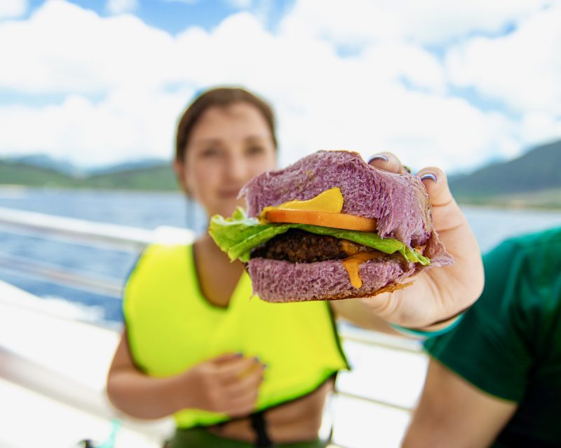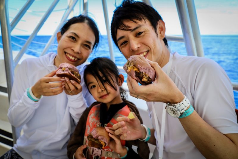ドルフィン&ユーのツアーのランチで大評判なのがこのチーズバーガー♫ 最初はみんな紫色のパンにびっくりするけれど、これが柔らかくておいし~い♪トロリととろけたチーズとシャキシャキ野菜&手作りハンバーグが最高に美味♡