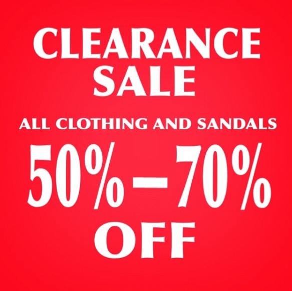 店内全ての衣類、サンダルが50%〜70%OFF!
