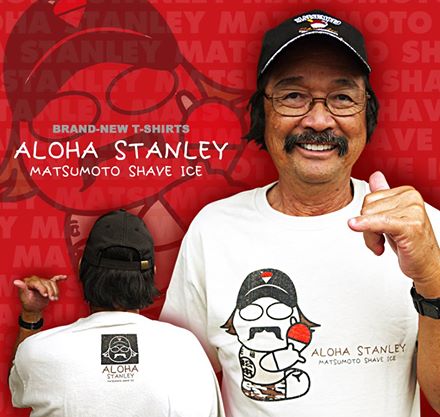 マツモトシェイブアイスのオーナーさんといえばノースショアの有名人、スタンリーさんです。 スタンリーさんの似顔絵いりTシャツ(似てる!)もあります。 とってもきさくなスタンリーさん、見かけたら「スタンリーさ~ん!」と声をかけてみてください!