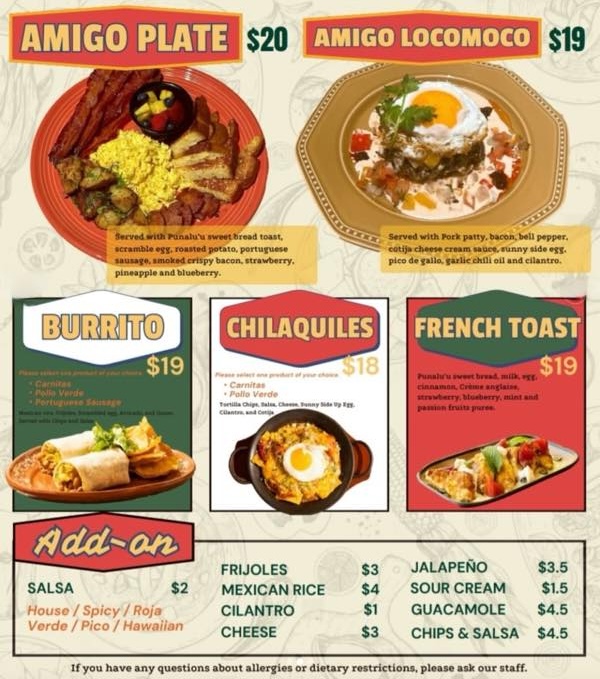 朝8時〜午後2時まで、アイランド×メキシカンの味わいが楽しめるブランチを提供中!心地よいハワイの朝にぴったりなラインナップです。