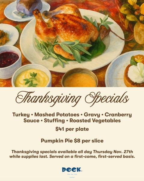 クイーンカピオラニホテルに入っているデックは、11月27日(木)の感謝祭も営業を行っております。感謝祭当日は、ターキーの特別メニューも登場。ターキー、マッシュポテト、グレイビー、クランベリーソース、スタッフィング、ローストベジタブルがセットになったプレートは$41、パンプキンパイは$8となっております。