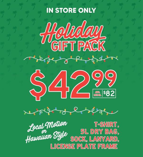 ローカルモーションまたはハワイアンスタイルのTシャツ、ドライバッグ、ソックス、ランヤード、ライセンスプレートフレームの詰め合わせが $42.99で手に入ります。お得なパッケージとなっているので、ぜひ店頭でチェックしてみてください。