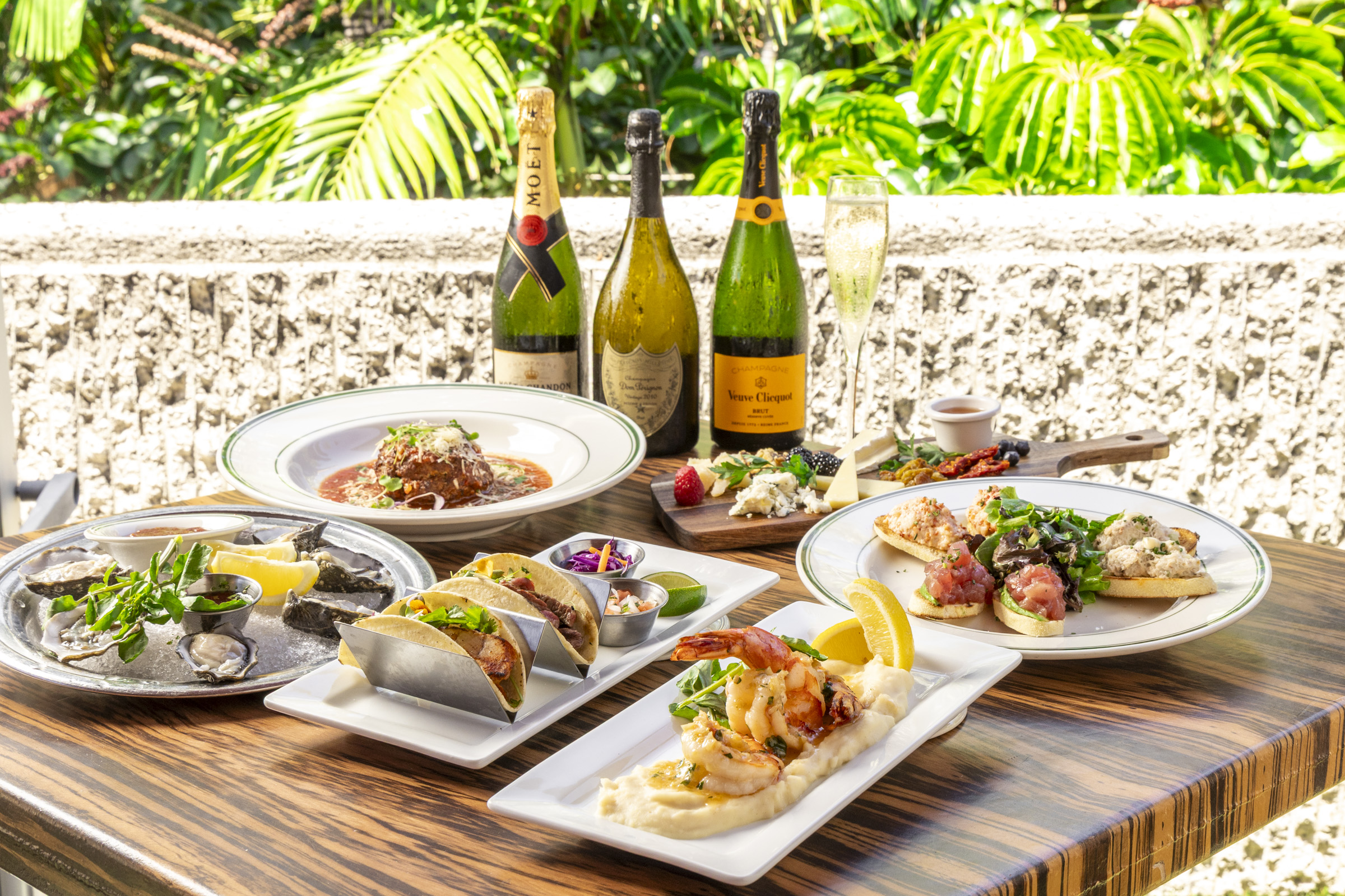ウルフギャングステーキハウスのラナイ席、Wラナイでは15:00〜18:00の時間帯でハッピーアワーを開催中!ジャンボガーリックシュリンプ($26.00)、USDAプライムリブ・テンダーロイン・ケバブ($19.00)、ザWロコモコ($17.00)など、Wラナイ限定のメニューも多数登場しています。