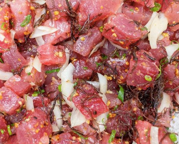 ポケフィックス・ハワイには様々な種類のポケがありますが、中でも人気はハワイアンスタイルアヒ。リム(海藻)が入ったハワイアンスタイルアヒは、新鮮な素材だからできるシンプルな味付け!ハワイ産マグロ、ノースショアのリム、ククイナッツ、ネギ、玉ねぎもオアフ産のものを使用しています。
