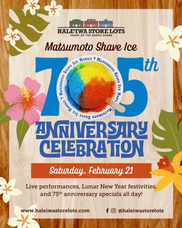 マツモトシェイブアイスの75周年を記念し、ハレイワ・ストア・ロッツにて「マツモト・シェイブアイス」75周年セレブレーションを開催します。ライブミュージックやパフォーマンスなども楽しめます!