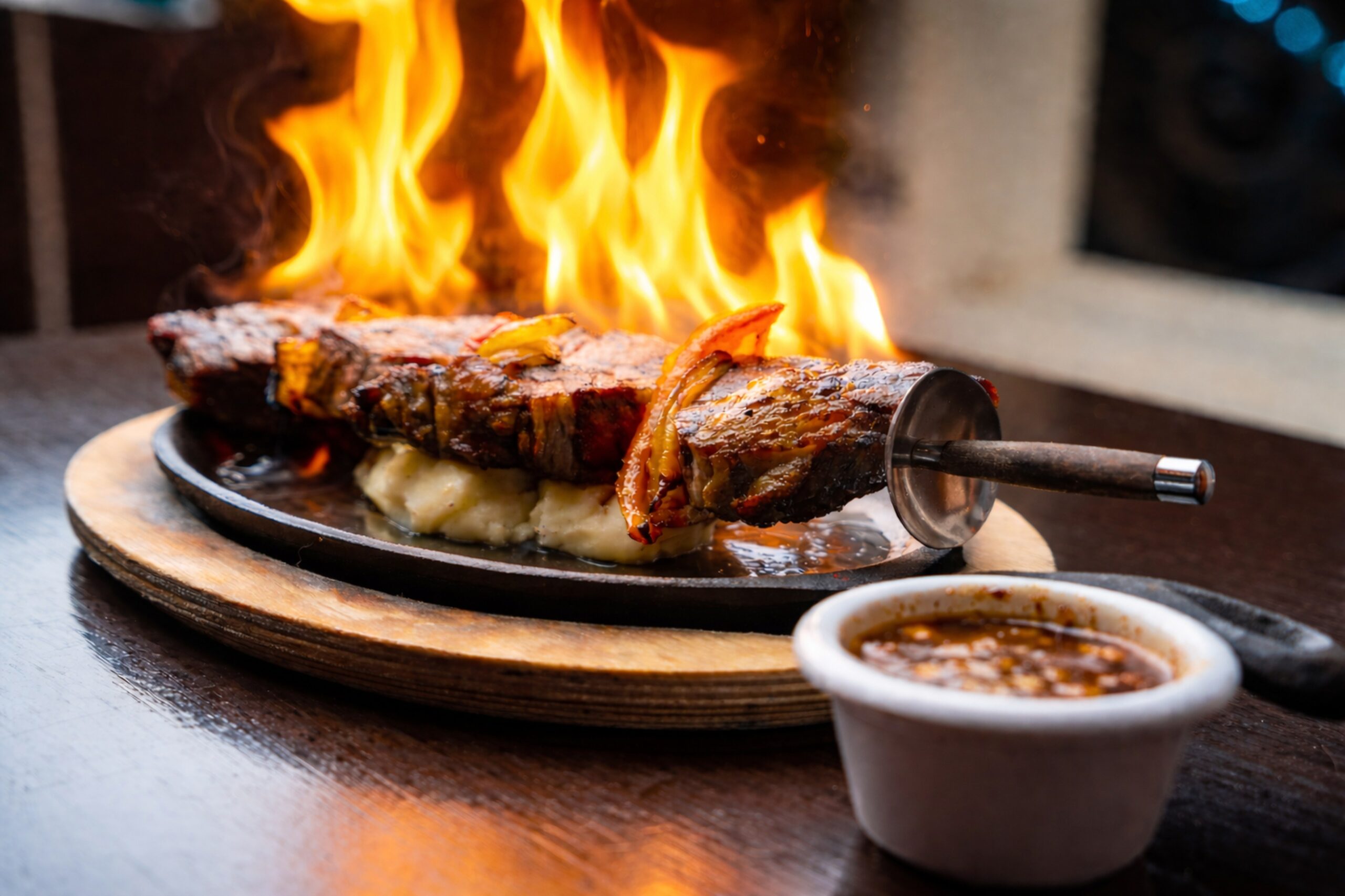 アンガスビーフのリブアイを串刺しにして、炎と共に提供します。