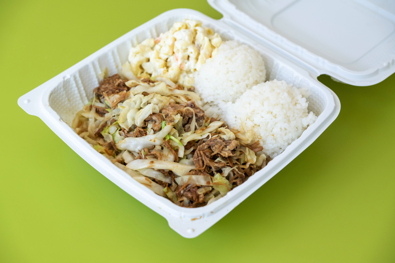 L&L ハワイアンバーベキューでは、ハワイ名物のカルアポークもお手軽にプレートスタイルで楽しめます。キャベツのシャキシャキ感と、カルアポークの旨みがたまらないメニューです。ミニサイズは$16.35、レギュラーサイズは$19.95の価格帯。ミニサイズでもボリューム満点です!