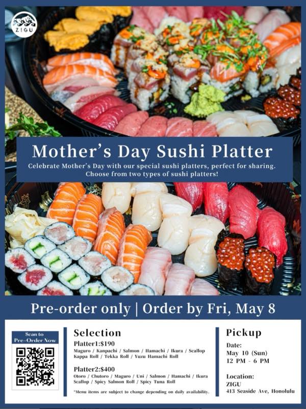 母の日に向けた特別な寿司プラッターのご予約を承っております。大切なお母さまに笑顔を届ける、シェアにも最適な2種類のセレクションをご用意しました!
