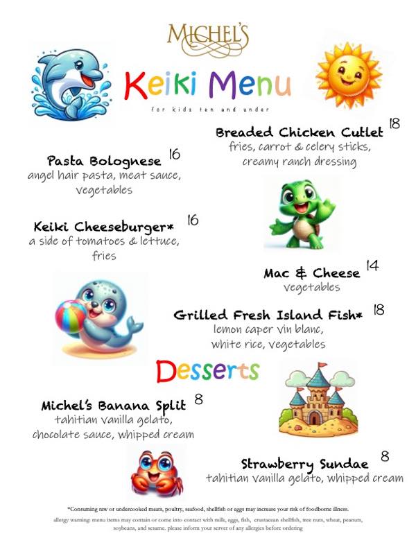 ミッシェルズ・アット・ザ・コロニーサーフでは、お子様連れでもお楽しみいただけるよう、キッズメニューもご準備しております。