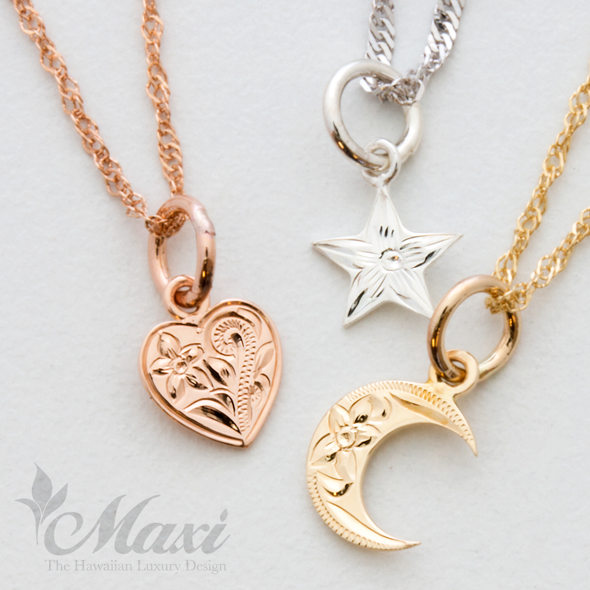 Pink Gold Heart Pendant Top, White Gold Star Pendant Top and Yellow Gold Moon Pendant Top!! 14kゴールドのペンダントトップ!ワイキキにある工房でひとつひとつ手作りしています。