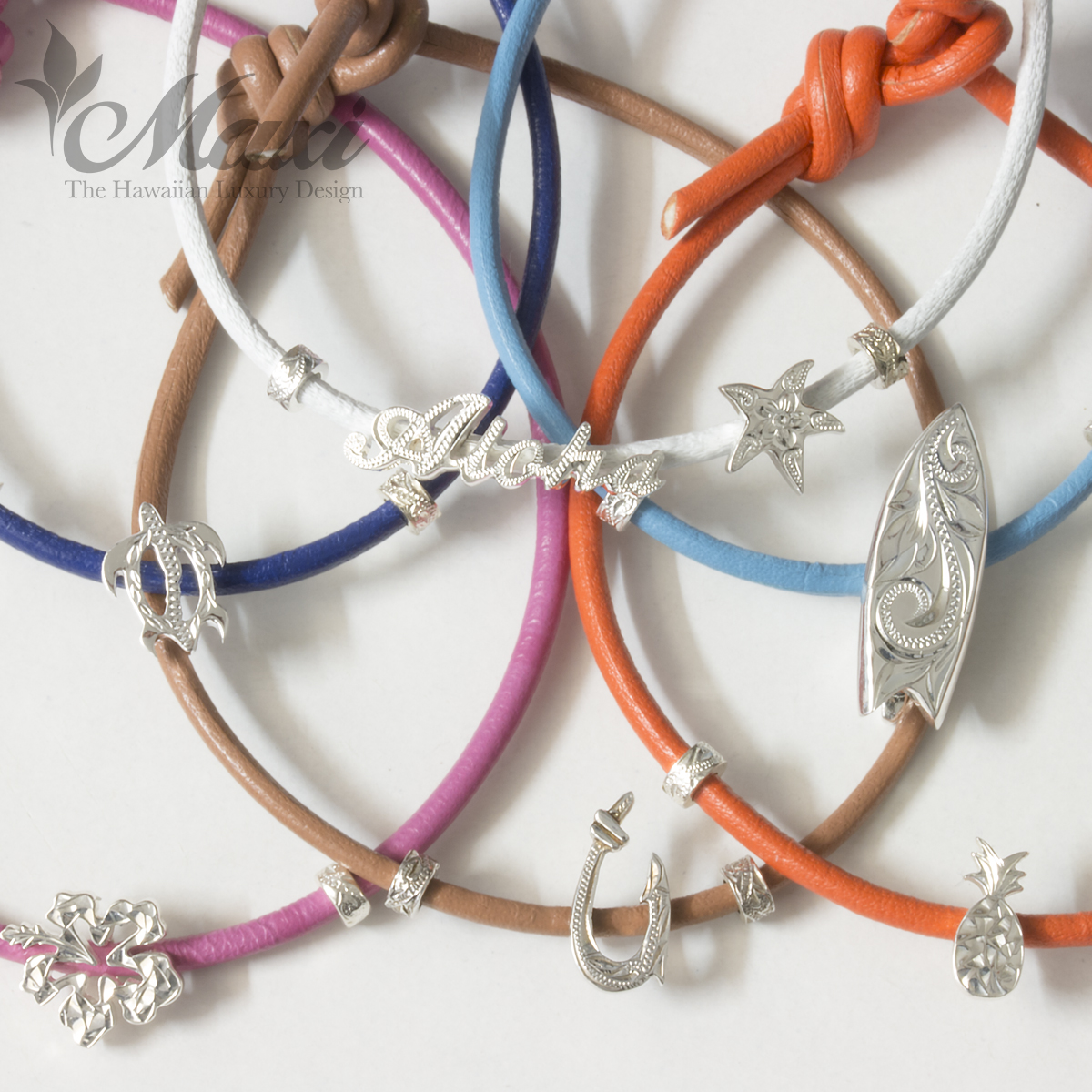 ハワイのロコに大人気!お好みのチャームとレザーの色、長さを選べます。お土産にもピッタリ!!