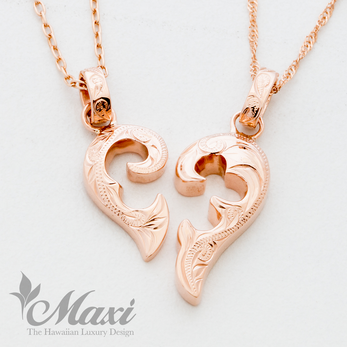 2つのペンダントを合わせるとハートになる人気の商品です!他にもシルバー925や14Kイエローゴールド、14Kホワイトゴールドもご用意しております。
