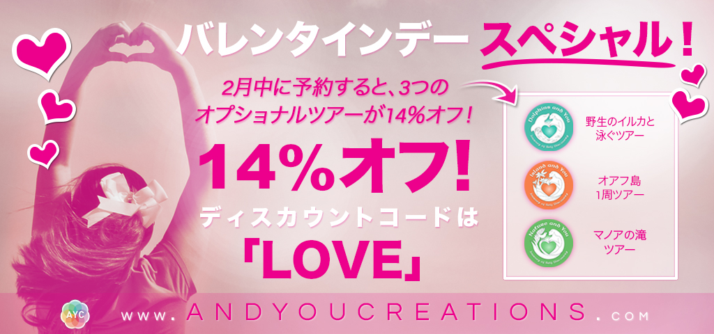 2月のイベントと言えば、なんと言っても「バレンタインデー❤︎」ですね!アンドユークリエーションズ/ドルフィン&ユーでは、2月のバレンタインデーラブラブキャンペーンを実施中です。「ドルフィン&ユー/野生のイルカと泳ぐツアー」「アイランド&ユー/オアフ島1周ツアー」「ネイチャー&ユー/マノアの滝ツアー」の3つのツアーがバレンタインデーにちなんで、それぞれ14%オフです!予約時にディスカウントコード「LOVE」を入れてください。ツアー日は、いつでもオッケーです。今がチャンスです!