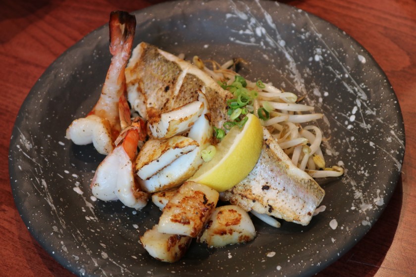 当店のシーフード盛り合わせは、海老、イカ、帆立貝柱、白身魚の4点。