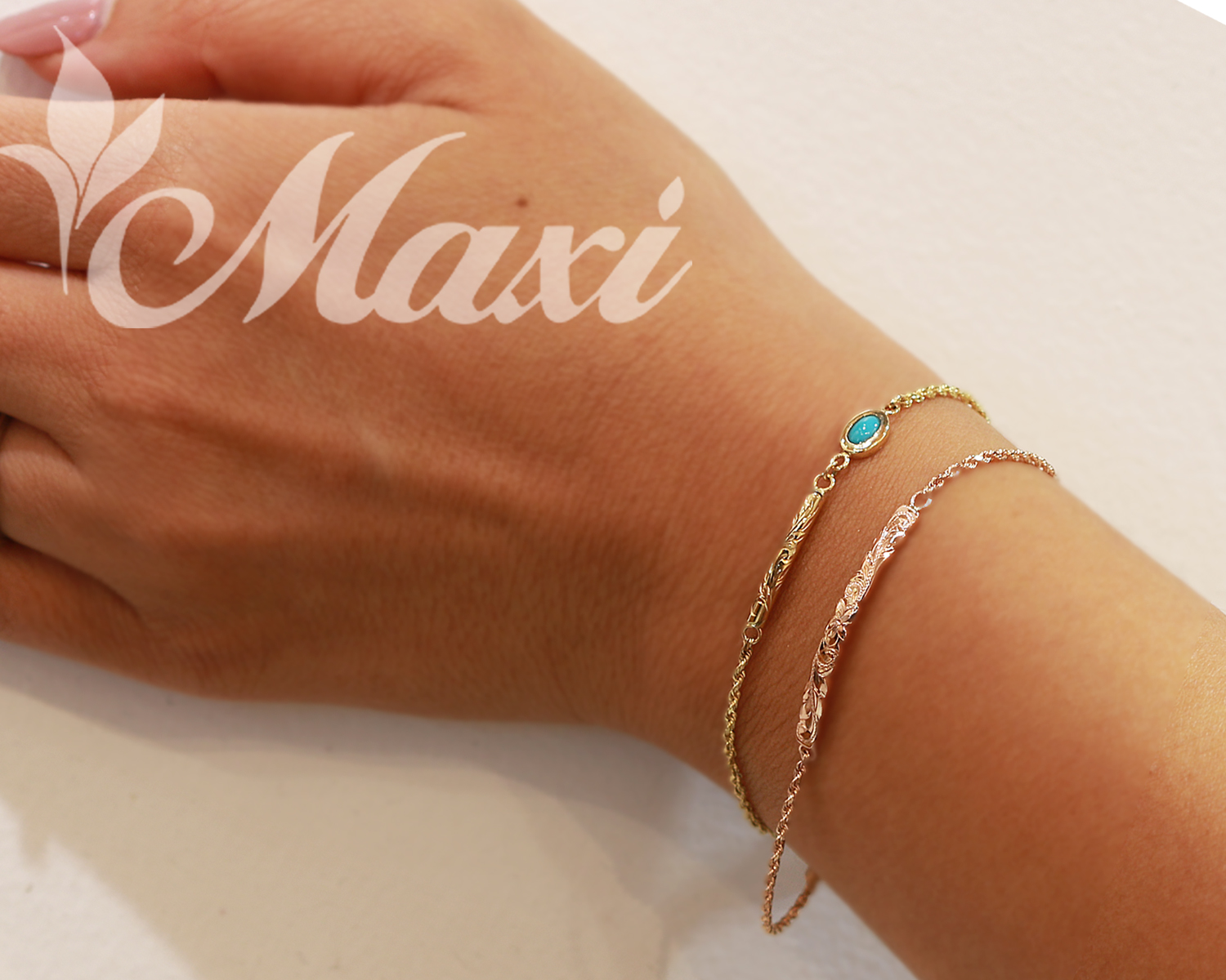 オールドイングリッシュデザインが綺麗に手彫りされた ID Braceret。そしてハワイの海のように真っ青な色がこれからの季節にぴったりなターコイズがセットされた Turquoise ID Bracelet。